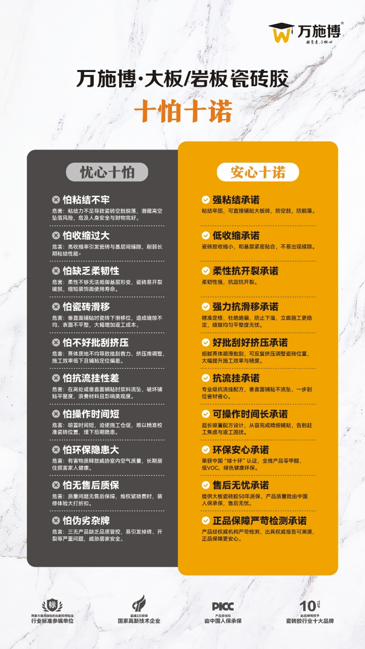 承诺:提供大板/岩板瓷砖胶50年质保,产品质量险由中国人保承保,售后无忧。